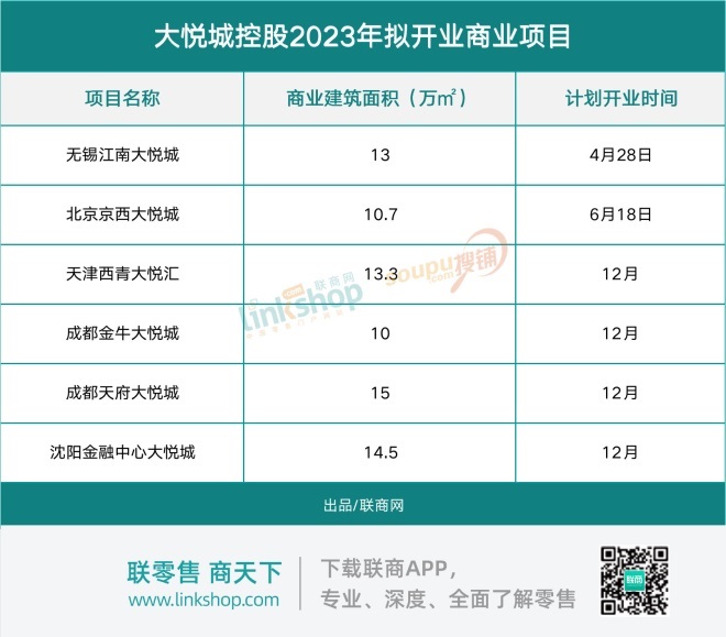 據(jù)聯(lián)商網(wǎng)零售研究中心統(tǒng)計,2023年大悅城控股商業(yè)計劃新開出6座商業(yè)項目,無錫江南大悅城、北京京西大悅城、天津西青大悅匯、成都金牛大悅城、成都天府大悅城、沈陽金融中心大悅城將悉數(shù)亮相。