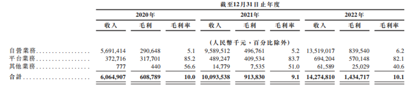 再具體來(lái)看,自營(yíng)業(yè)務(wù)毛利率低至6%左右,但自營(yíng)業(yè)務(wù)過(guò)去三年更貢獻(xiàn)了93%以上的營(yíng)收(2022年更貢獻(xiàn)135.19億元,占比94.7%)。反倒是擁有高毛利的平臺(tái)業(yè)務(wù),營(yíng)收僅為6.942億元,占比4.9%(2022年)。簡(jiǎn)言之,掙錢(qián)的業(yè)務(wù)占比太小。