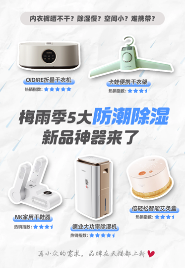 除此之外,針對(duì)小戶型不占地方的烘干需求、大戶型急速除濕、鞋履烘干等小眾需求,近期海爾、美的、小天鵝、德業(yè)、多樂信等數(shù)10個(gè)品牌,在天貓推出了可折疊烘干機(jī)、大功率急速除濕機(jī)、干鞋機(jī)等上百款新品,讓更多人能清爽過梅雨天。