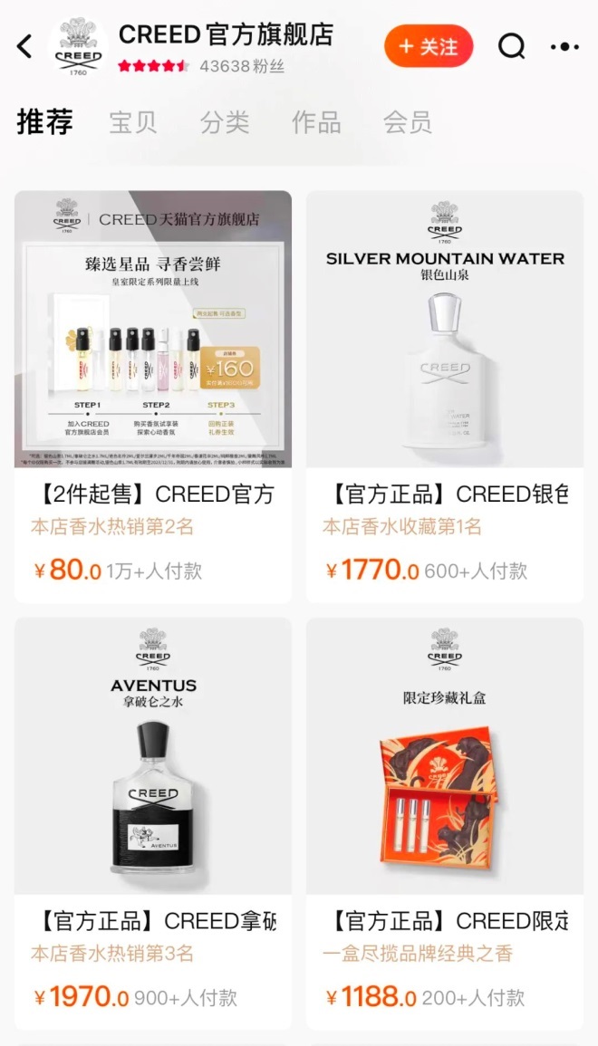 線上渠道方面,CREED天貓官方旗艦店粉絲數(shù)超4萬(wàn)人,產(chǎn)品價(jià)格大多在1500元至2900元間,其中售價(jià)為80元的明星試香小樣銷量最高,付款人數(shù)超1萬(wàn)人,售價(jià)為1970元的拿破侖之水付款人數(shù)也突破900人。據(jù)了解,CREED目前尚未入駐抖音渠道。