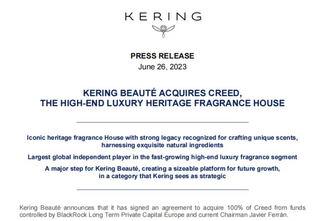 6月27日,青眼號(hào)外獲悉,開云集團(tuán)(Kering)發(fā)布公開聲明,宣布收購(gòu)香水品牌Creed(愷芮得),但暫未透露具體金額。值得注意的是,這是開云集團(tuán)自2月份成立美妝部門后進(jìn)行的第一筆收購(gòu)。