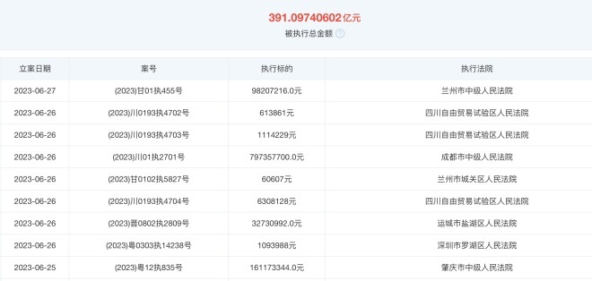 截止目前,恒大地產(chǎn)被執(zhí)行總金額超過391億元。