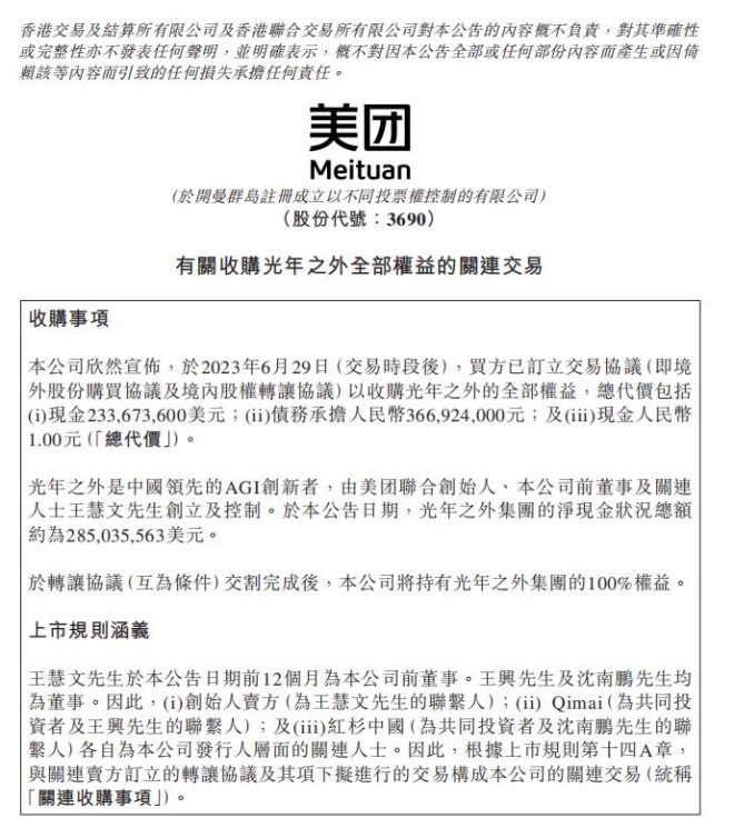 美團(tuán)方面表示,光年之外是中國領(lǐng)先的AGI創(chuàng)新者,由美團(tuán)聯(lián)合創(chuàng)始人、本公司前董事及關(guān)連人士王慧文先生創(chuàng)立及控制。于本公告日期,光年之外集團(tuán)的凈現(xiàn)金狀況總額約為285,035,563美元。交割完成后,美團(tuán)將持有光年之外集團(tuán)的100%權(quán)益。