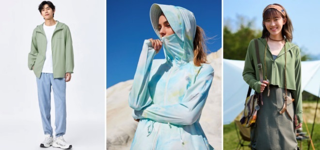 在原有防曬功能升級之上,版型設(shè)計(jì)、顏色和穿搭的個性化,以及高科技防曬面料成為新的趨勢,兼顧科技感和時尚感的防曬產(chǎn)品受到追捧。如在京東熱賣的升級原紗防曬技術(shù)的蕉下男士防曬衣、主打Movestech UV涼感防曬技術(shù)的蕉內(nèi)涼皮防曬衣、采用了暮光防曬科技的OhSunny男士戶外防曬衣、可阻隔全波段紫外線的VVC蕾羅娜面料冰絲防曬衣等,滿足防曬、涼感、吸濕、速干透氣等多重功能,備受年輕消費(fèi)者喜愛。還有蕉下女士披肩防曬衣,前短后長,更凸顯身材。