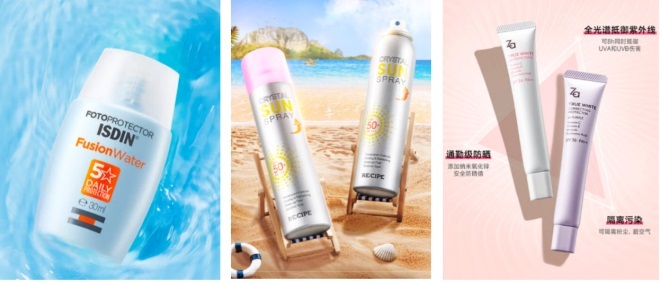 防曬護(hù)膚產(chǎn)品也同樣有著精細(xì)化的消費(fèi)需求,針對多元使用場景及不同膚質(zhì),都需要不同的防曬護(hù)膚產(chǎn)品。如怡思丁Fusion Water沁融水感防曬液,其獨(dú)家的水感科技和無油配方能使膚感更清爽;RE:CIPE玥之秘水晶防曬噴霧,輕松補(bǔ)噴,方便快捷,全身可用,適用于通勤/旅游/露營/運(yùn)動等多種戶外場景,姬芮(ZA)的第五代紫色煥真潤色隔離霜,配方升級添加了可降解成分,產(chǎn)品的環(huán)保度大大提升。