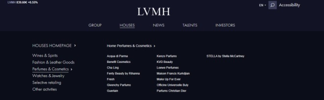 據(jù)官網(wǎng)資料來看,LVMH作為全球知名的奢侈品巨頭,旗下包含了路易威登、迪奧、香奈兒等在內(nèi)的多個奢侈品品牌,業(yè)務(wù)遍及時裝與皮具、手表和珠寶、香水和化妝品、烈酒葡萄酒和精品零售的五大商業(yè)領(lǐng)域。在化妝品領(lǐng)域則擁有嬌蘭、迪奧、紀(jì)梵希、馥蕾詩等16個美妝品牌。