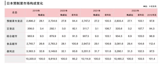 據(jù)日本預(yù)制菜協(xié)會(Japan Souzai Association)《2023年預(yù)制菜白皮書》所述,2022年,日本預(yù)制菜規(guī)模同比增長3.5%,達10兆4652億日元。較2019年市場規(guī)模多出101.4%,已經(jīng)恢復(fù)至新冠疫情前的水平。按照經(jīng)營形態(tài)劃分,2022年,日本預(yù)制菜銷售額由高到低排序分別為:CVS(便利店)、食品超市、預(yù)制菜專賣店、綜合超市和百貨店。