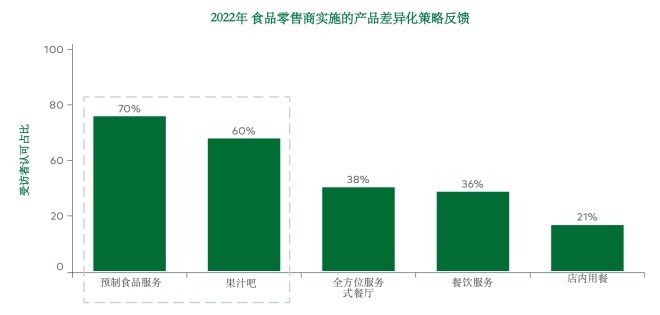業(yè)界公認,針對預(yù)制菜、店內(nèi)食品服務(wù)的投資是最具可行性的成功之道。美國食品工業(yè)協(xié)會(FMI)的研究指出,75%的食品零售商表示,他們于2021年采用了預(yù)制菜的差異化策略,一年過后,其中表示此策略有所成效的人達70%。