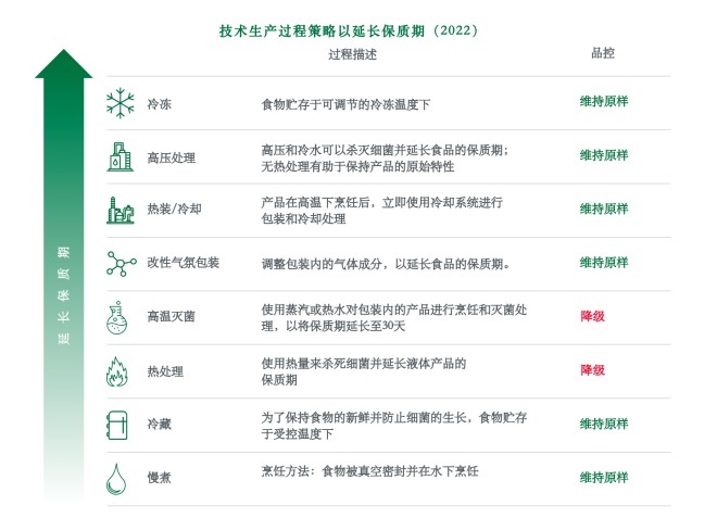 盡管一類食品自身的天然保質(zhì)期就足夠長,但大多數(shù)生產(chǎn)商仍會采用特定技術(shù)或防腐劑來延長其保質(zhì)期。防腐劑是一種常見的、相對簡便的,用于延長食品保質(zhì)期的方法,但鑒于部分零售商和消費者對其仍抱有負面的刻板印象,于是有越來越多的生產(chǎn)商轉(zhuǎn)而采用高壓處理(HPP)、改性氣氛包裝(簡稱MAP,是一種食品包裝技術(shù),通過調(diào)節(jié)包裝內(nèi)的氣氛成分,延長食品的保質(zhì)期。適用于易氧化或易腐敗的食品,如生鮮肉類、海鮮、蔬菜、水果和面包)和冷凍運輸?shù)燃夹g(shù)來延長保質(zhì)期。這一類技術(shù)可提升食品安全性能,滿足各類清潔標簽的要求,吸引消費者前來消費。