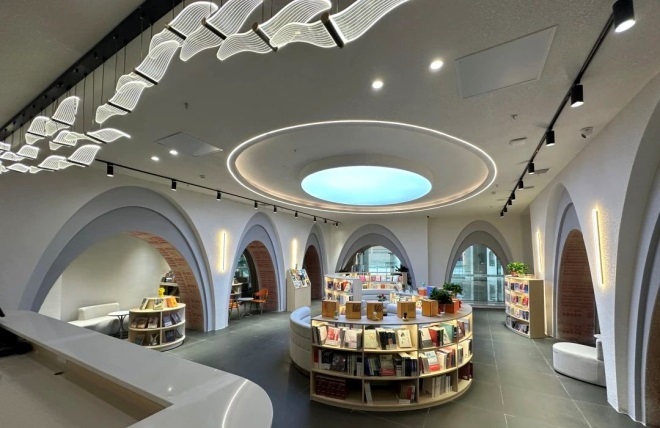 海鹽北大街店則以幾何特有屬性與海鹽本土化特點(diǎn)為靈感進(jìn)行設(shè)計(jì),打造了一個(gè)充滿當(dāng)?shù)卦兀孢m的閱讀氛圍的空間,致力于傳達(dá)一種平衡和諧的感覺。