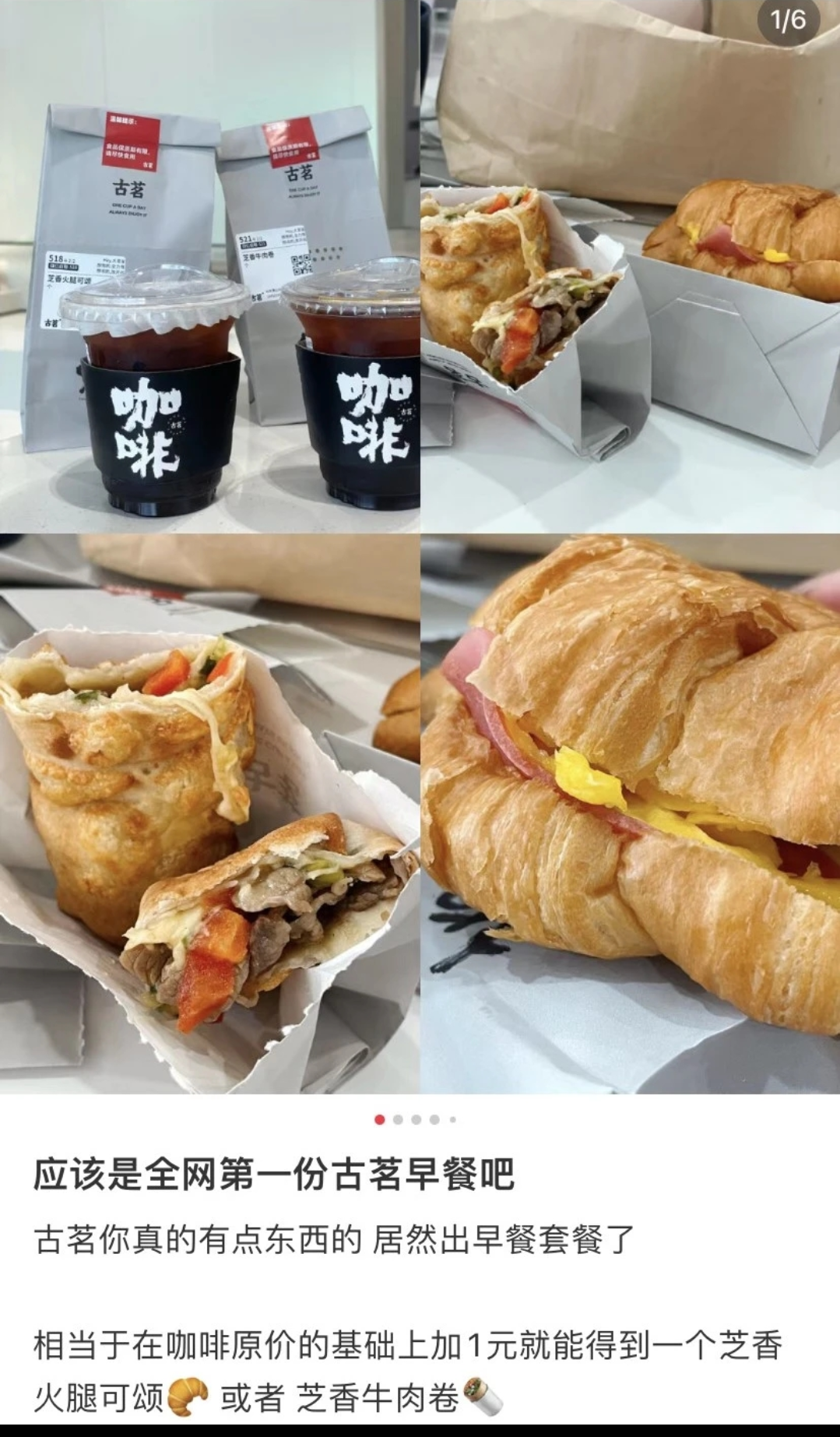 最近,很多小紅書博主曬出了古茗早餐,消費(fèi)者只需花十幾元就能購(gòu)買拿鐵或者美式,并搭配一份芝香火腿可頌或者芝香牛肉卷。對(duì)此,消費(fèi)者表示劃算又好吃。