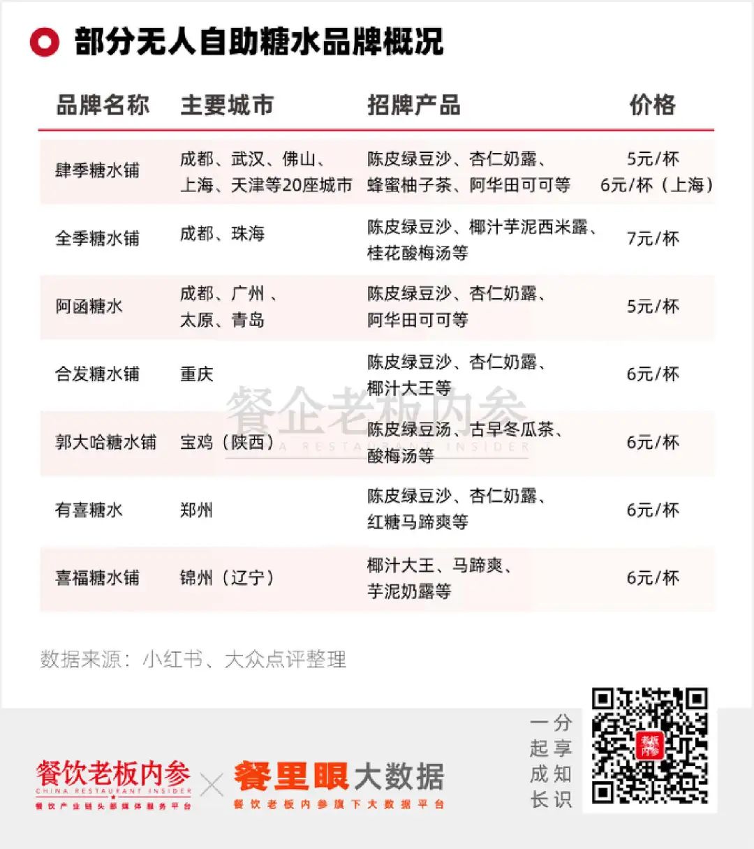 成都有包括“肆季、每季、全季、暖記、田記”等數(shù)十個(gè)品牌;廣東有包括“恰冰記、汕飲、全季、肆季”等品牌;杭州、南京、重慶、青島等地也出現(xiàn)包括“春嬌奶奶、名發(fā)、合發(fā)、阿函糖水鋪”等,均為無(wú)人自助糖水品牌。