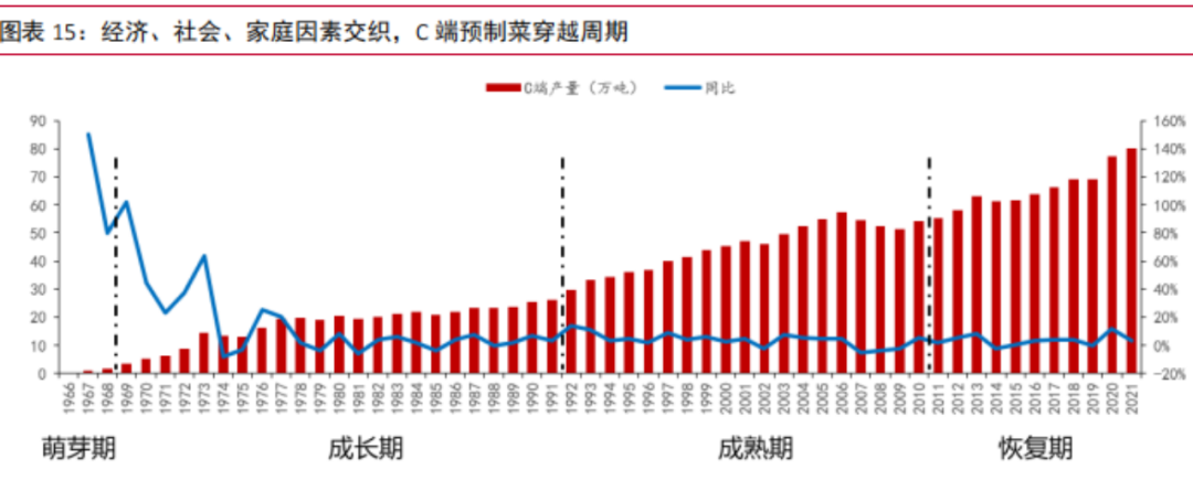成長期發(fā)生在1968年至1991年,日本經(jīng)濟(jì)快速擴(kuò)張,城鎮(zhèn)化率普及后,女性們開始外出工作,在外就餐率的提升,預(yù)制菜得以快速滲透。