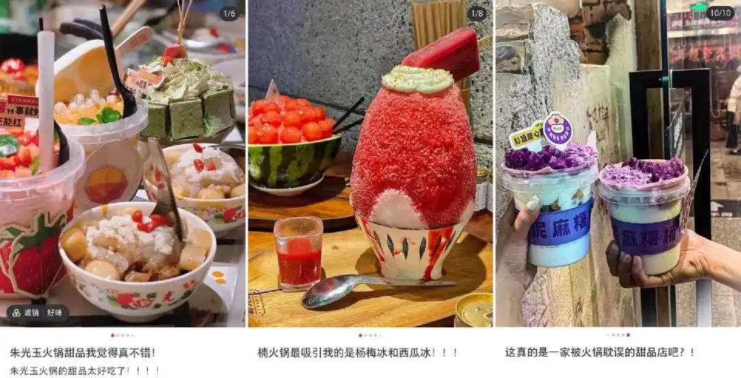 這些火鍋店里的甜品,在吸引復(fù)購的好味道外,有著遠(yuǎn)超“正經(jīng)甜品店”的獨(dú)特魅力,比如觀感震撼、擬物造型、有地域特色、能帶動(dòng)流量傾斜...