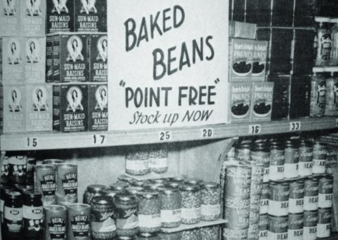 許多零售商幫助顧客應(yīng)對配給制的不便,提供“無需配給點(diǎn)”的肉類替代方案。“無需配給點(diǎn)”的產(chǎn)品包括豆類、谷類和面食。美國民眾購買商品時(shí)需要使用物資配給簿中的“券”,憑券購買配給食品。OPA根據(jù)每種食品可獲得難易度為其分配一定數(shù)量的點(diǎn)數(shù),顧客每月可以使用48個(gè)“藍(lán)點(diǎn)”購買罐裝或者瓶裝的加工食品或干雜食品,使用64個(gè)“紅點(diǎn)”購買肉類、魚類和乳制品——如果這些商品在市場上有庫存的話。
