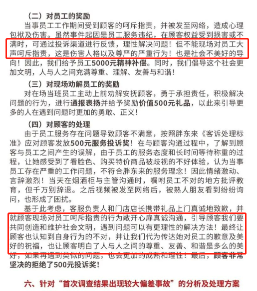 這份調(diào)查報告內(nèi),胖東來表示由于服務(wù)存在問題,管理人員全部降級3個月,并攜禮物與500元服務(wù)投訴獎,上門為顧客致歉,事后顧客堅決拒絕了500元投訴獎。