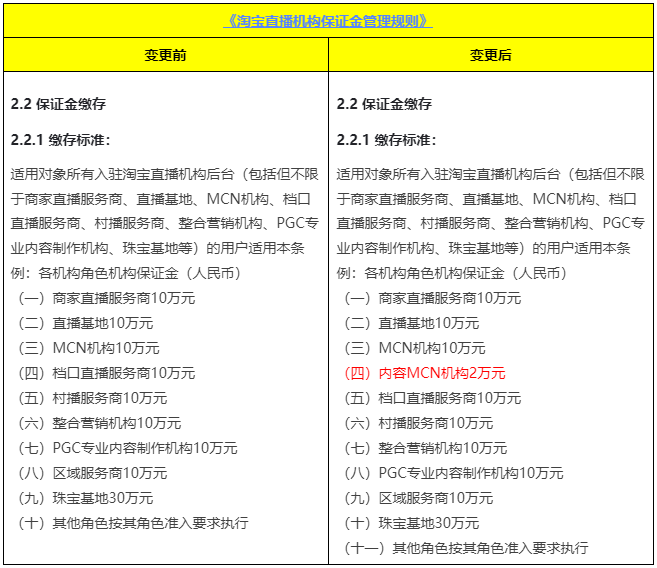 其中,差別最為明顯、最引人注目的,是淘寶為內(nèi)容MCN機構設立的保證金繳存標準。