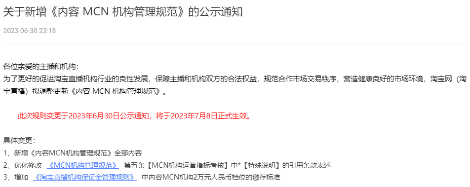 近日,淘寶新增《內(nèi)容MCN機構管理規(guī)范》(以下簡稱《規(guī)范》),將于7月8日正式生效。