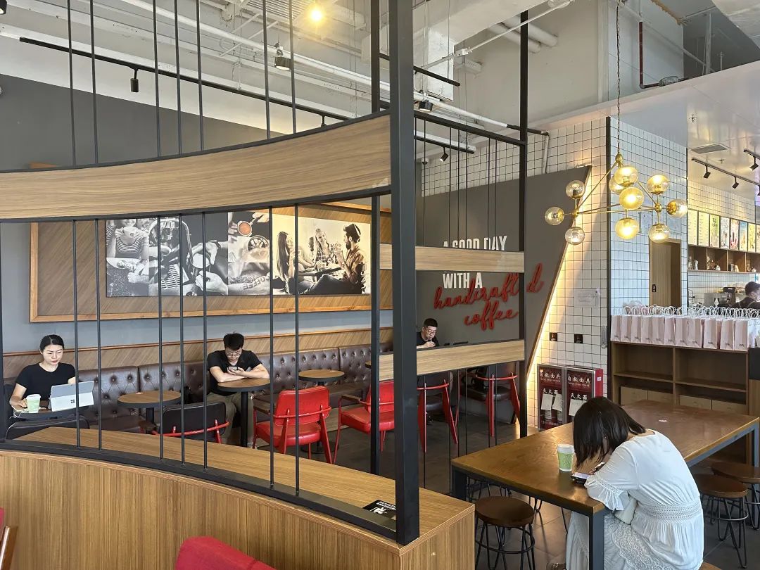 相較之下,太平洋咖啡在裝修上一直沒(méi)有改變?cè)械纳虅?wù)風(fēng)格,門(mén)店仍是以黑色為底色,搭配商務(wù)洽談常用的紅沙發(fā)。在大大小小的咖啡店都在努力卷裝修、卷體驗(yàn)的時(shí)代里,這樣的設(shè)計(jì)不免有些“老氣橫秋”,難獲消費(fèi)者芳心。