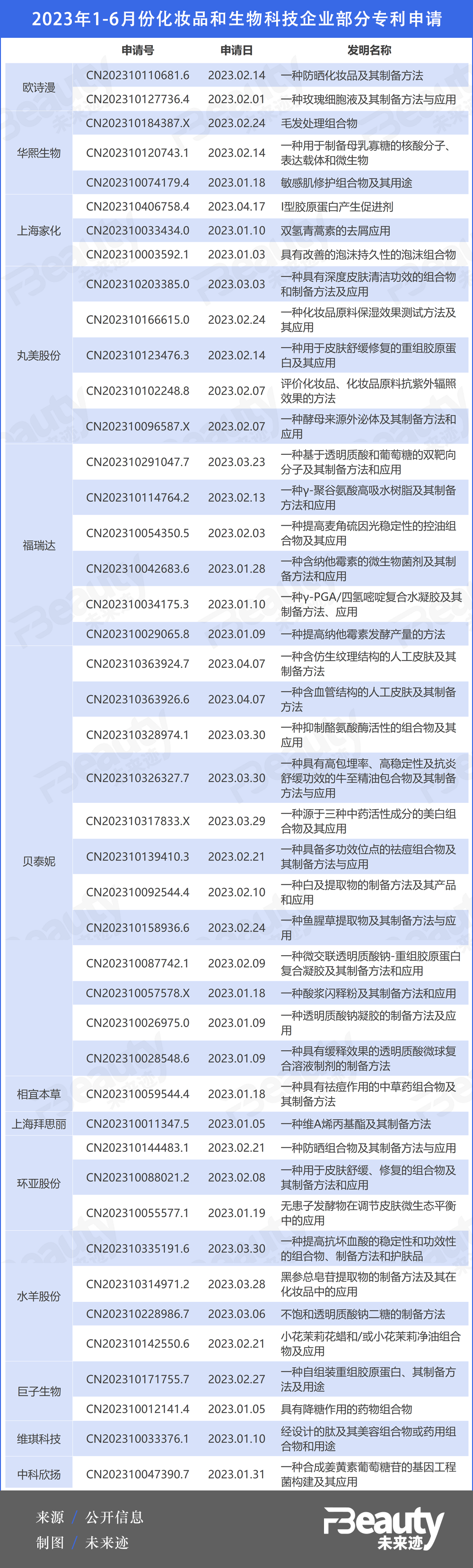 除此之外,《FBeauty未來跡》還觀察到,相較于上半年,美妝企業(yè)的專利申請普遍集中在下半年,華熙生物、珀萊雅、上海家化等多家企業(yè)的發(fā)明專利申請數(shù)基本都在下半年翻番!斑@一情況很可能與企業(yè)研發(fā)周期有關(guān)!睆?zhí)姳硎,企業(yè)大都在上半年進(jìn)行準(zhǔn)備工作,下半年提交給法務(wù)部門。