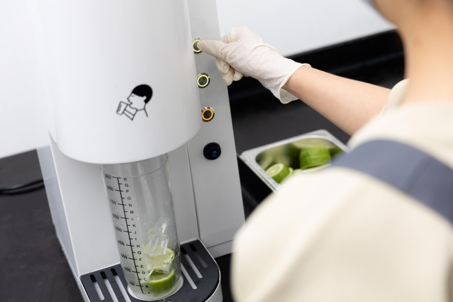 圖:喜茶店員使用自動捶檸檬機制備鮮果