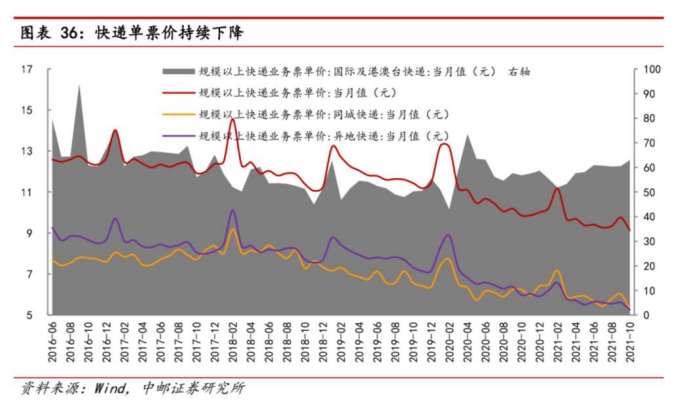 兩輪價(jià)格戰(zhàn)后,快遞行業(yè)單票價(jià)格持續(xù)下降,圖/中郵證券