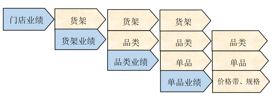 如下圖所示,門店的業(yè)績是由貨架業(yè)績所決定,而貨架業(yè)績是由各品類加總而成,各品類的業(yè)績就是由“單品+單品”,而單品又可以細分不同的規(guī)格(價格帶)。