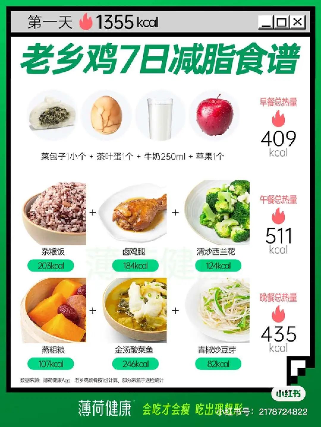或許是為了坐實(shí)自己減脂餐的名頭,老鄉(xiāng)雞在今年5月和薄荷健康合作,給每份食物標(biāo)了熱量,還推出了【老鄉(xiāng)雞7日減脂食譜】,似乎在暗示消費(fèi)者:只要你一周七天、一天三頓,頓頓吃在老鄉(xiāng)雞,那你必瘦。