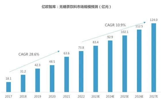 以無(wú)糖飲料產(chǎn)品為例,億歐智庫(kù)發(fā)布的數(shù)據(jù)顯示,早在2017年前后,“減糖、無(wú)糖”就成為飲料行業(yè)的重點(diǎn)發(fā)展方向,2017年-2021年相關(guān)市場(chǎng)的年復(fù)合增長(zhǎng)率為28.6%。