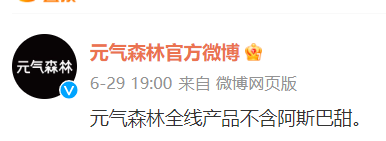 作為國(guó)產(chǎn)新銳飲料品牌,元?dú)馍致氏仍谄涔俜轿⒉┗貞?yīng):“元?dú)馍秩(xiàn)產(chǎn)品不含阿斯巴甜!