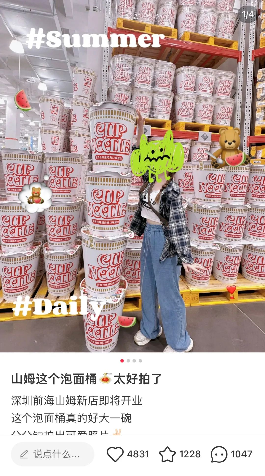 山姆前海店用一個裝著20多杯泡面的“大”號包裝,狠狠抓住了消費(fèi)者的“出片”心理,門檻不高,但有極高社交價值。