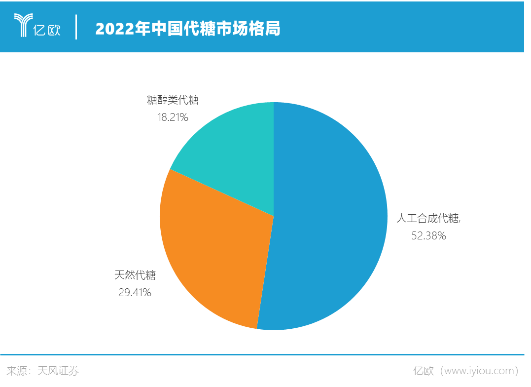 天風(fēng)證券的研究報(bào)告顯示,截至2022年,人工合成代糖在中國代糖的市場份額為52.38%,是應(yīng)用最多的代糖;天然代糖和糖醇類代糖的市場份額分別為29.41%和18.21%,擁有很大的增長空間。