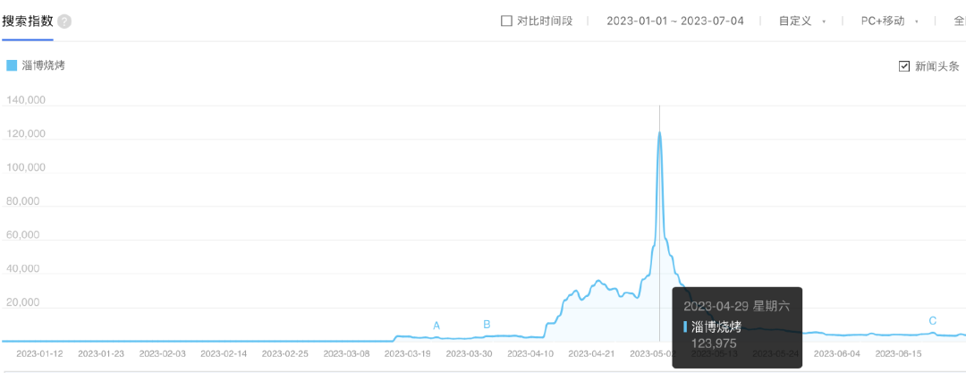 百度指數(shù)顯示,淄博燒烤的熱度在五一假期達到最高峰,之后快速跌落,但仍高于同年的1—3月。