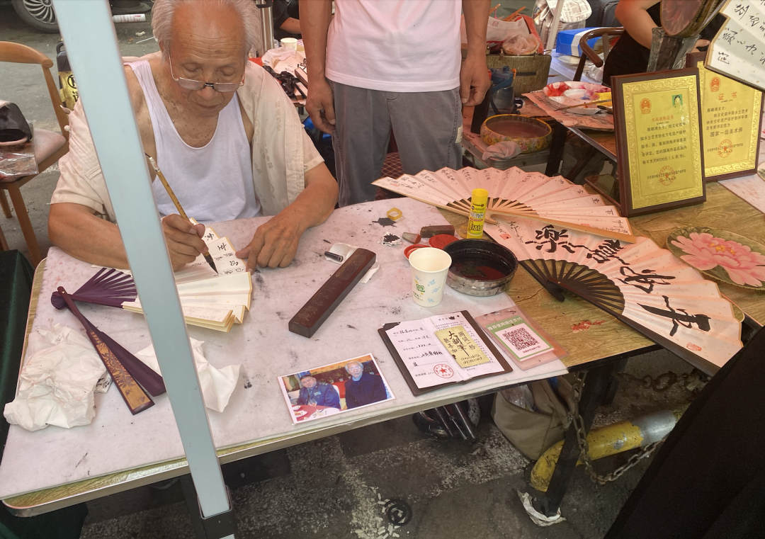 還未進市場,就被結(jié)結(jié)實實的人流嚇到了,市場門口兩側(cè)分布著百來個攤位,書法、國畫大師匯聚,畫山畫水畫hello kitty,寫詩寫詞寫俏皮話,拎著紫米餅的小姐姐正在攤位上挑選古風古色的扇子,旁邊的兩只“綠青蛙”正賣子求生……
