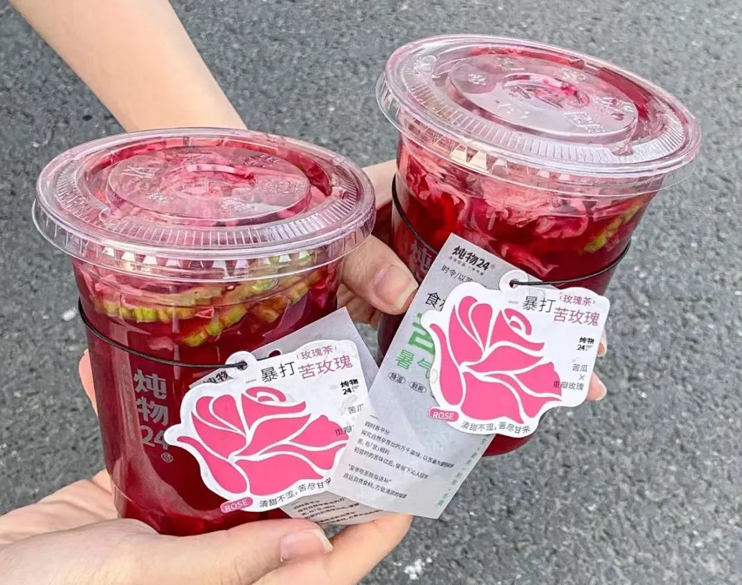 比如,燉物24章推出的暴打苦玫瑰,注入玫瑰花、洛神花熬制而成的素顏水,不僅清爽回甘,玫瑰紅的色彩也讓人眼前一亮。