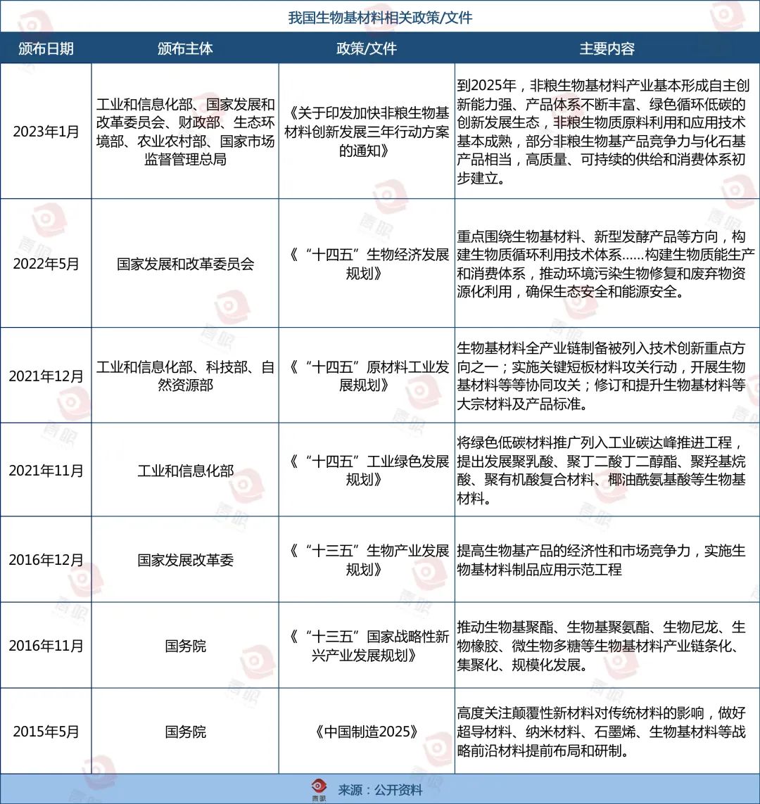 值得一提的是,為促進我國生物基材料產(chǎn)業(yè)創(chuàng)新發(fā)展,近年來國家陸續(xù)出臺多部政策,為生物基材料行業(yè)的發(fā)展提供支持與規(guī)劃指導(dǎo)。如在2022年,國家發(fā)改委就出臺了《“十四五”生物經(jīng)濟發(fā)展規(guī)劃》,其中將生物能源穩(wěn)步發(fā)展、生物基材料替代傳統(tǒng)化學(xué)原料、生物工藝替代傳統(tǒng)化學(xué)工藝等列入發(fā)展目標。
