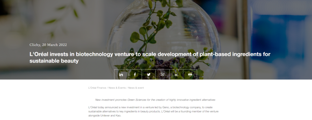 進入2023年以來,“生物基”開始頻繁地出現(xiàn)在歐萊雅的對外投資與合作當(dāng)中。如在3月份,歐萊雅和生物技術(shù)公司Geno聯(lián)合宣布,歐萊雅將通過企業(yè)風(fēng)險基金B(yǎng)OLD投資由Geno主導(dǎo)的一家合資公司,作為合資公司的創(chuàng)始成員之一。該合資公司的創(chuàng)始成員還包括聯(lián)合利華和花王。