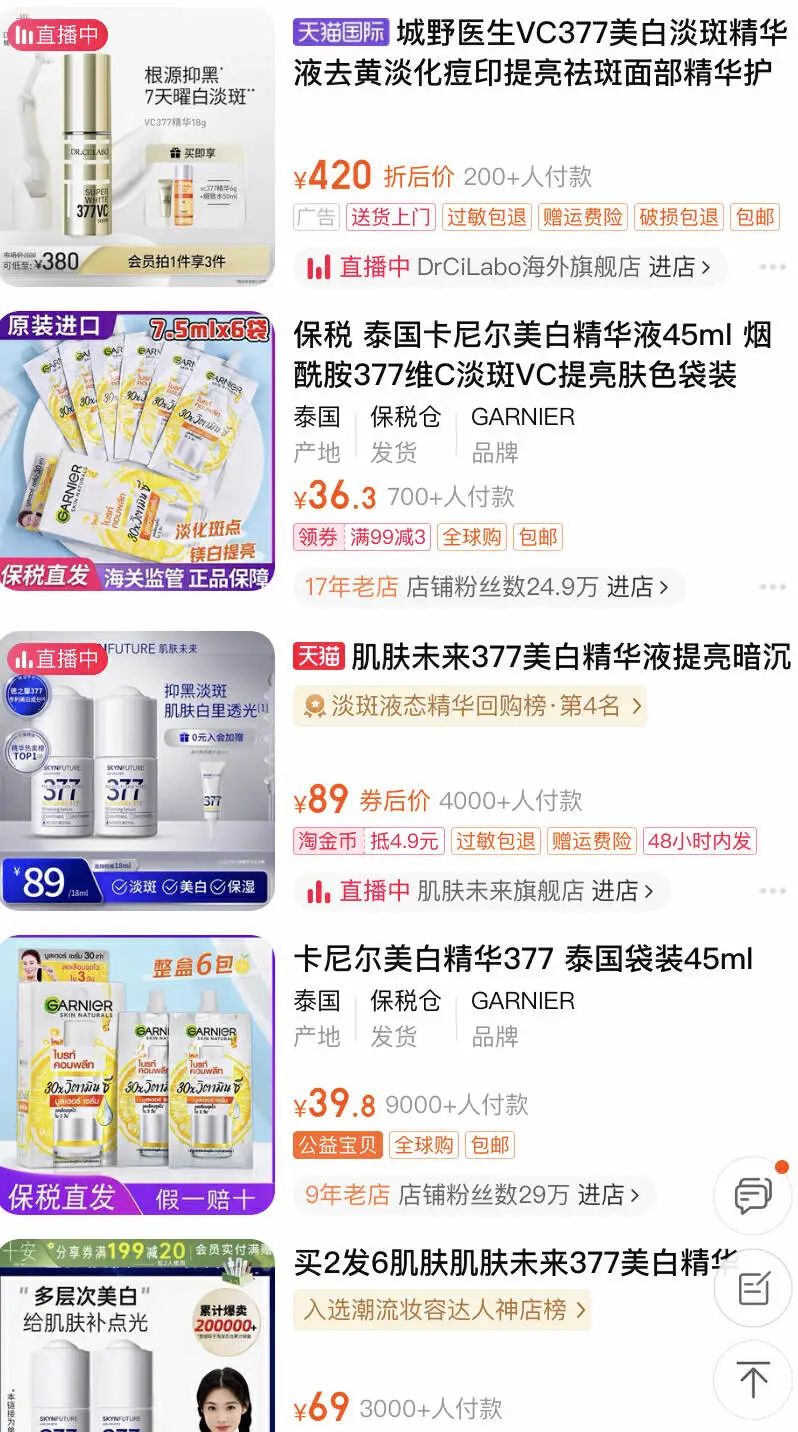 2021年日本品牌城野醫(yī)生的377美白精華橫空出世,成為人手一支的美白產(chǎn)品,在接下來的一段時(shí)間里,出現(xiàn)了大量含有377的類似精華產(chǎn)品!翱377是一個(gè)需要走特征的美白產(chǎn)品,在當(dāng)時(shí)特征備案至少都要一年。”蛋炒飯解釋,所以當(dāng)時(shí)的很多產(chǎn)品要么是“擦邊”,要么直接買特征進(jìn)行套牌。