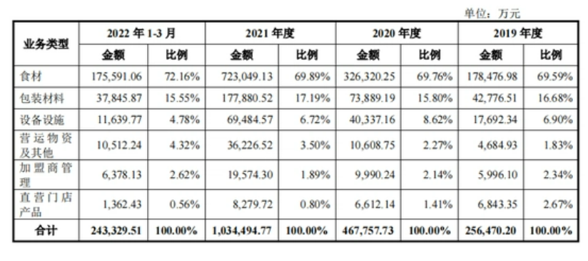 其中,對加盟商銷售產(chǎn)品收入分別為24.27億元、45億元、98.50億元、22.77億元,占各期總營收的比例分別為94.58%、96.16%、95.16%、93.53%。