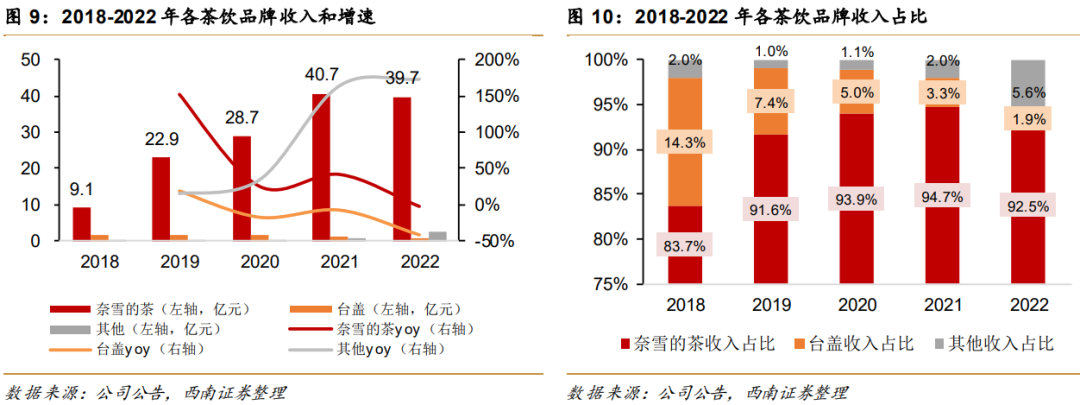 主品牌奈雪的茶作為奈雪集團業(yè)務(wù)重心,收入貢獻超9成,副品牌臺蓋收入貢獻不足2%,企業(yè)的經(jīng)營表現(xiàn)基本上可等同于主品牌的經(jīng)營表現(xiàn)。