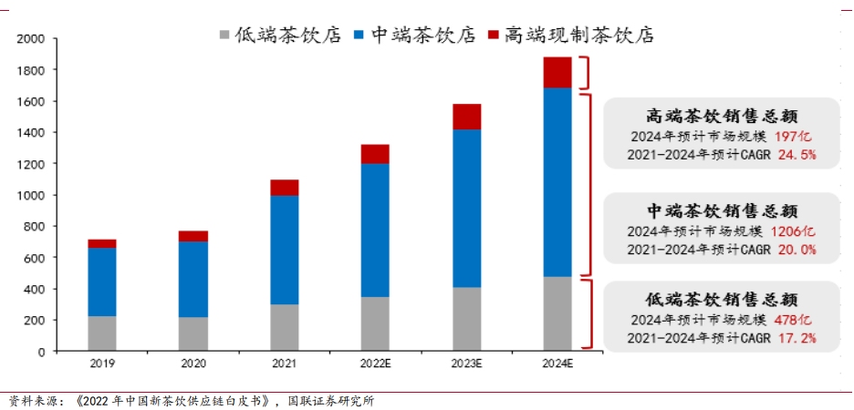除卻供應(yīng)鏈竄貨問題,高端茶飲的定位也意味著奈雪即便放開加盟,能拓展的市場空間也更為有限。根據(jù)弗若斯特沙利文預(yù)測數(shù)據(jù),2024年高端茶飲市場規(guī)模僅為197億元,遠低于中低端茶飲市場規(guī)模。