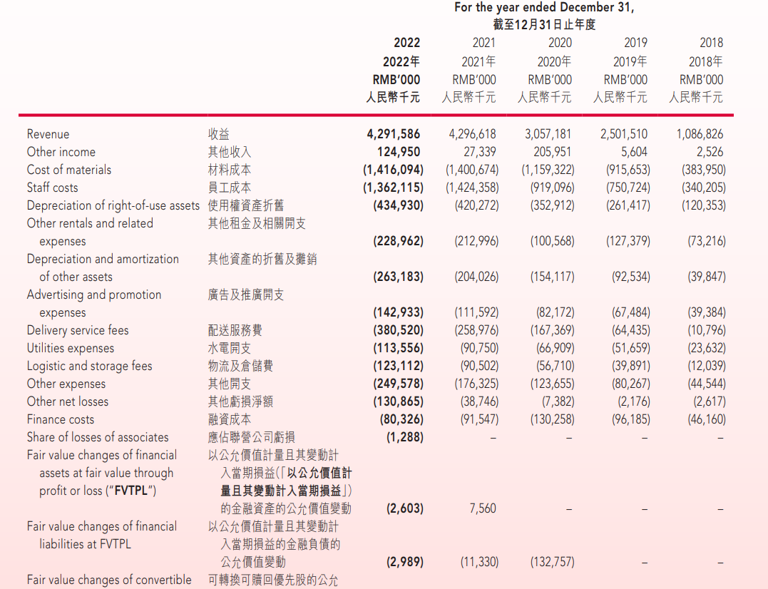 但門店數(shù)量增長需要需要充足的人力、物力提供現(xiàn)實基礎(chǔ)。為維持拓店節(jié)奏,奈雪投入成本也在不斷抬升。其中,材料、租金、員工成本從7.97億元提高至30.07億元,占總營收比例始終穩(wěn)定在70%以上。加之使用權(quán)資產(chǎn)折舊、廣告及推廣、配送服務(wù)費等開支,奈雪長期處于入不敷出的狀態(tài)中。