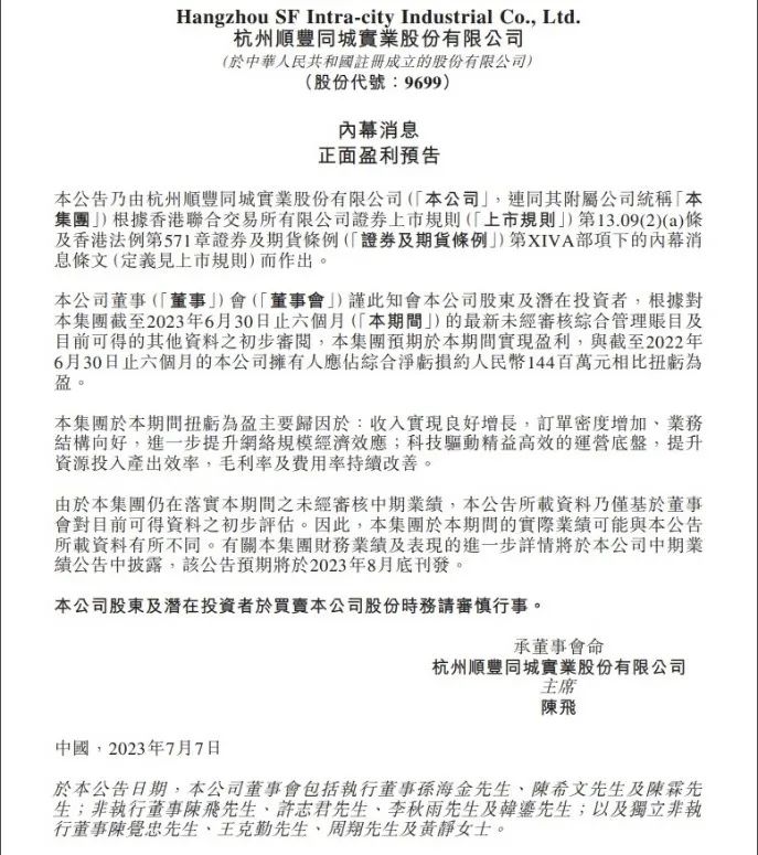 圖源:順豐控股股份有限公司2023年半年度業(yè)績(jī)預(yù)告