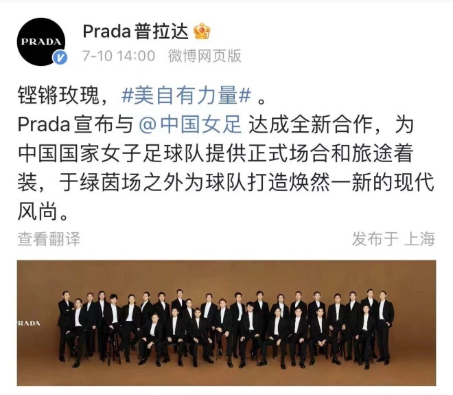 7月10日,中國(guó)足球協(xié)會(huì)官微官宣,Prada成為中國(guó)國(guó)家女子足球隊(duì)官方合作伙伴。Prada也在其官微同步發(fā)布了這一消息。Prada表示,此次合作中,將為中國(guó)國(guó)家女子足球隊(duì)提供正式場(chǎng)合和旅途著裝,于綠茵場(chǎng)之外為球隊(duì)打造煥然一新的現(xiàn)代風(fēng)尚。