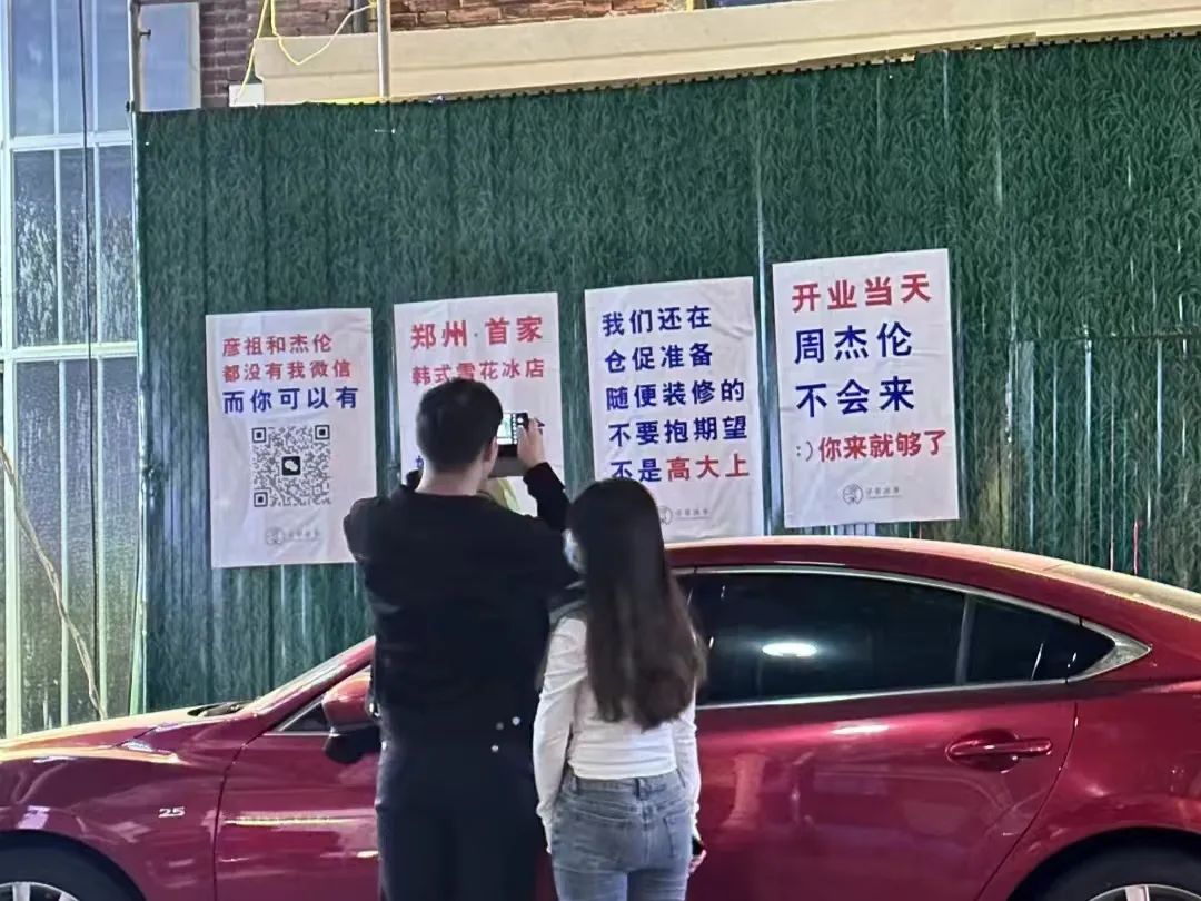 比如,鄭州的尋常冰事,開在當(dāng)?shù)匾粋(gè)文化創(chuàng)意園中,綠皮圍擋上只貼了4張海報(bào),上面寫著“鄭州首家韓式雪花冰店,不湊合不迎合,好吃就完事”,“彥祖和杰倫都沒(méi)有我的微信,而你可以有”等等,引發(fā)不少路人駐足圍觀。