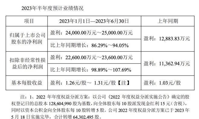 2023年上半年,鹽津鋪?zhàn)宇A(yù)計(jì)實(shí)現(xiàn)歸屬上市公司股東的凈利潤(rùn)2.4億元-2.5億元,同比增長(zhǎng)86.29%-94.05%;扣除非經(jīng)常性損益后的凈利潤(rùn)2.26億元-2.36億元,同比增長(zhǎng)98.89%-107.69%;基本每股收益1.26元-1.31元。
