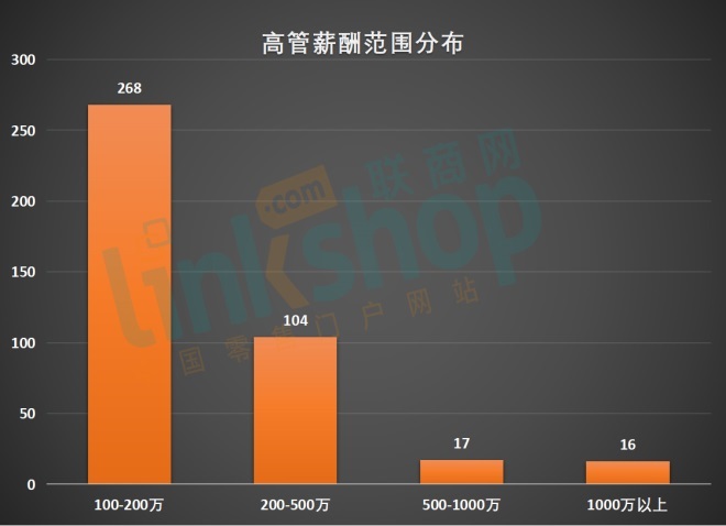此外,榜單中薪酬在500萬以上1000萬以內(nèi)的高管有17位,占比4.2%;薪酬在200萬(含)至500萬以內(nèi)(不含)的高管達104位,占比25.7%;薪酬在100萬(含)至200萬以內(nèi)(不含)的高管達268位,占比66.2%,這一范圍也是零售上市企業(yè)高管們的普遍薪酬水平。