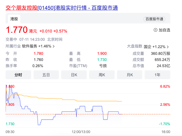 交個朋友控股開盤1.78港元/股,漲1.13%;截至發(fā)稿前,交個朋友每股來到了1.77港元,總市值24.53億。