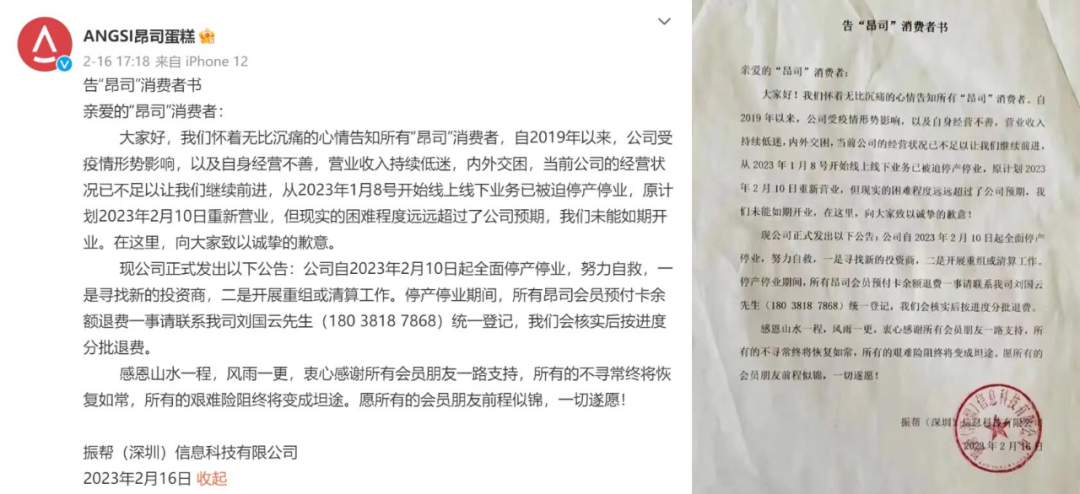 黃金地段、高昂造價、明星站臺的昂司烘焙最終沒能活過第5個年頭,在今年年初昂司蛋糕官方宣布全面停業(yè)停產、準備重組清算。
