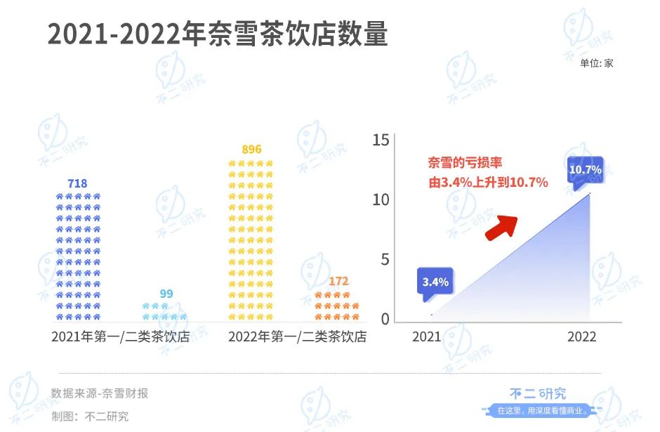 去年,奈雪新增門店超200家,均為租金和人工成本更低的Pro店,但仍處于持續(xù)虧損的狀態(tài)。2021-2022年奈雪的虧損率由3.4%上升到10.7%。
